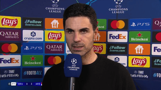 虎扑12月11日讯阿森纳主教练阿尔特塔在3-0击败布鲁日的欧冠赛后,接受TNTSport采访。